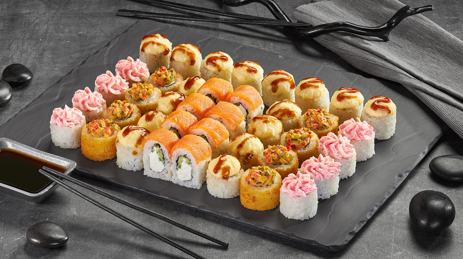 Ролл Филадельфия лайт сяке (8 шт), Ролл Калифорния микс (8 шт), Ролл Мистер барбекю (8 шт), Ролл Лава с креветкой (8 шт), Ролл Чикен темпура (8 шт), Ролл Нежный с курицей запеченный (8 шт), Ролл Сумоку запеченный (8 шт). *Внешний вид блюда может отличаться от фото на сайте.