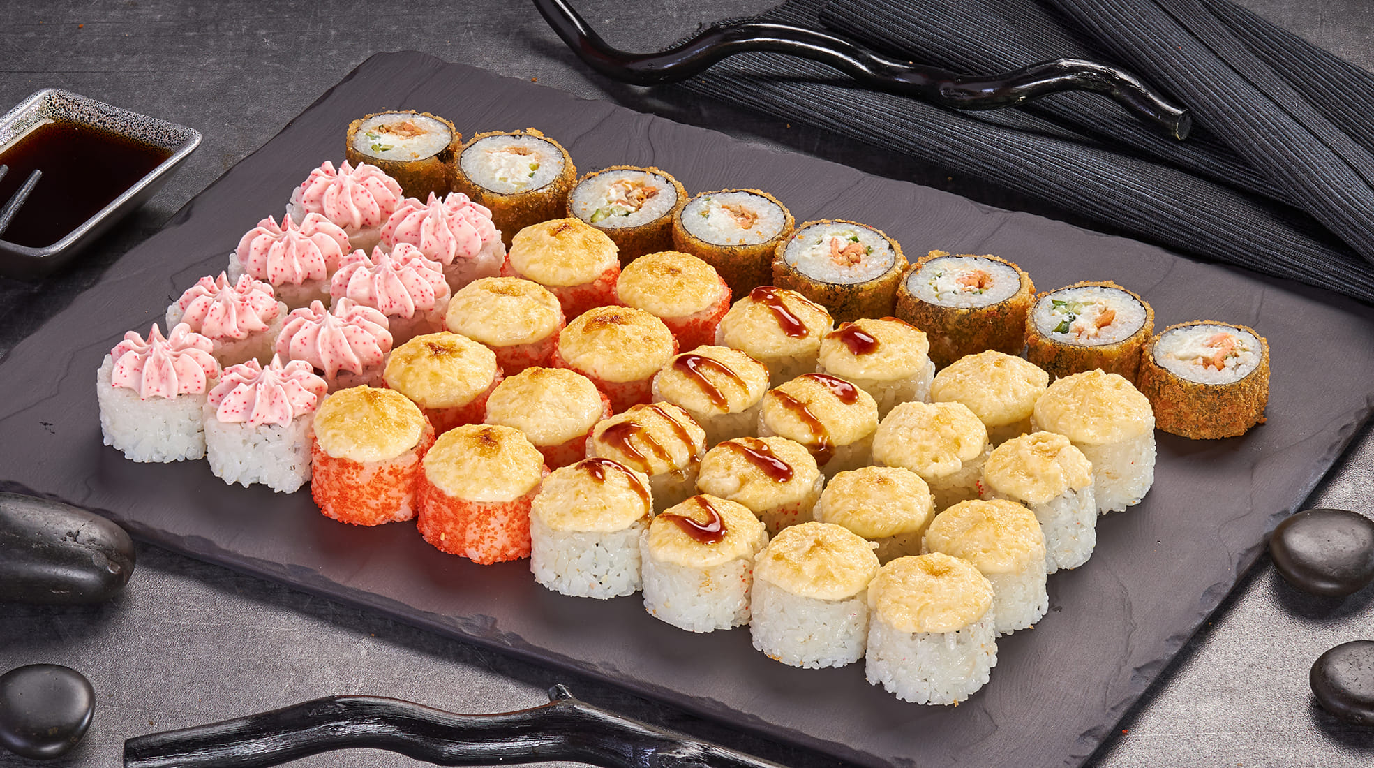 Ролл Калифорния в кунжуте (8 шт.), ролл Лава с крабом (8 шт.), ролл Филадельфия лайт сяке (8 шт.), ролл Калифорния темпура (8 шт.), ролл Нежный с лососем запеченный (8 шт.), ролл Оливье темпура (8 шт.), ролл Мистер Крабс запеченный (8 шт.), Мини ролл с огурцом (8 шт.) *Внешний вид блюда может отличаться от фото на сайте.